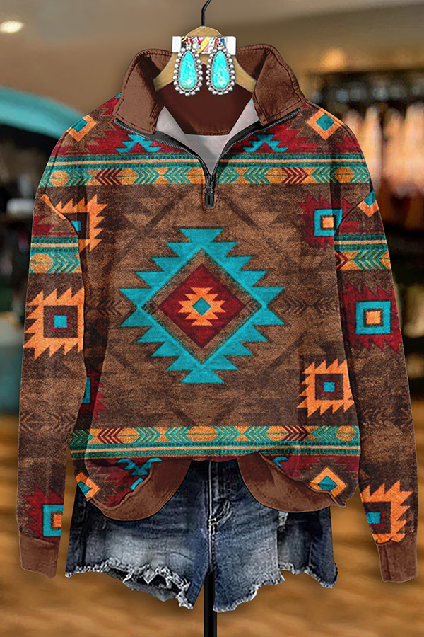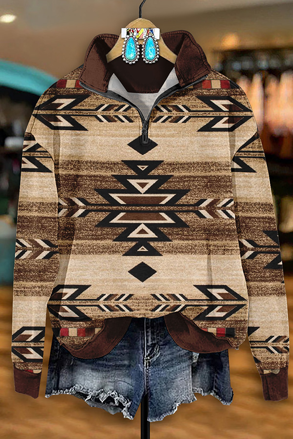 Retro Western Aztec Print Zip-Up Sweatshirt