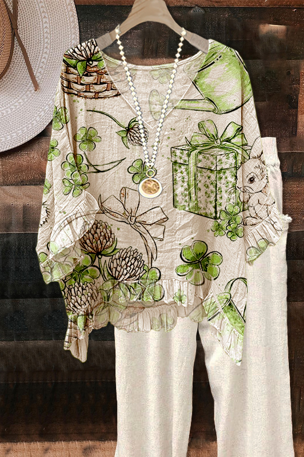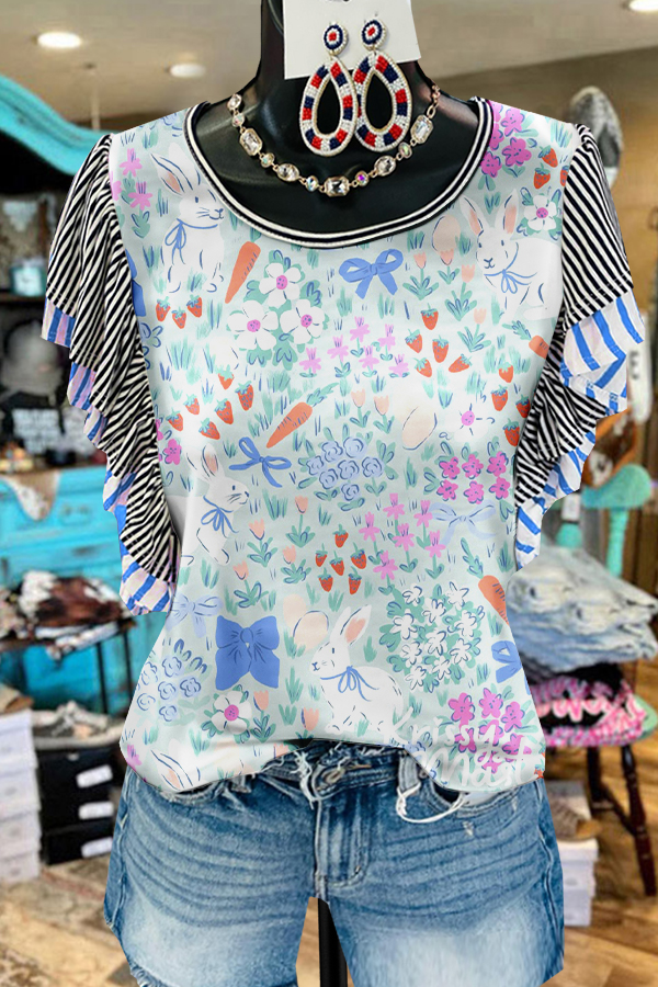 Cute Easter Bunny Eggs Print Ruffled Sleeve Paneled Pleated Blouse