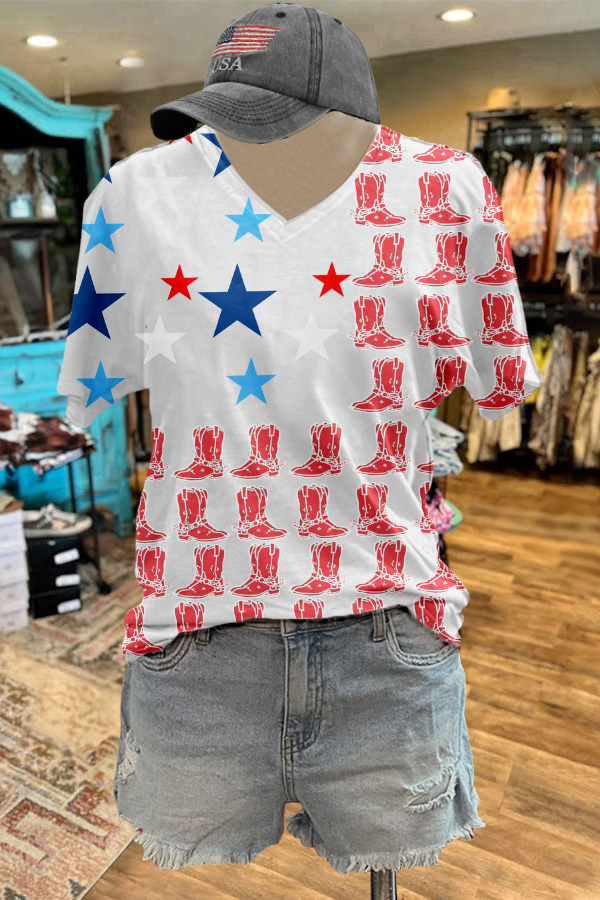 Chic Stars Patriotic Day Print Puff Sleeve Blouse