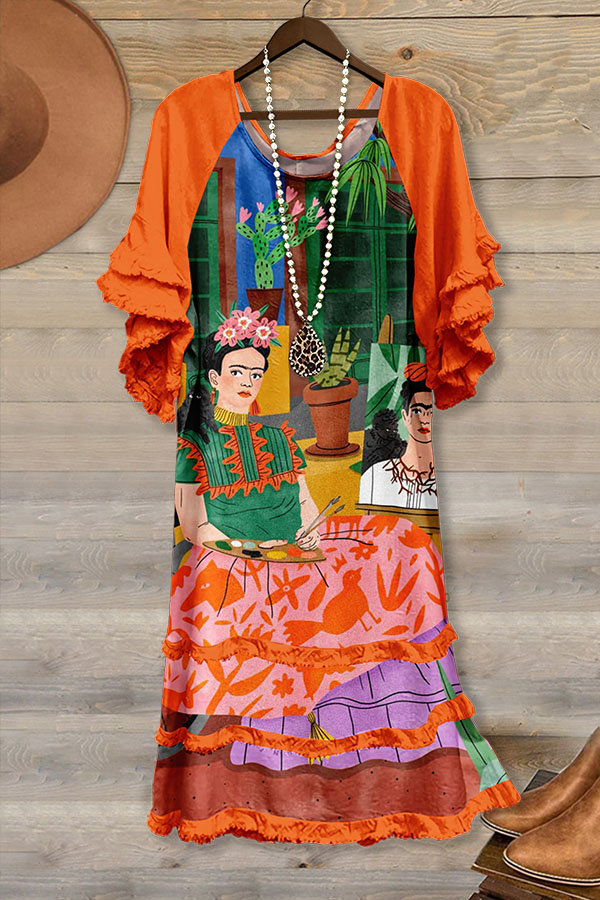 Frida Painting Scene Ruffled Raglan Midi Dress