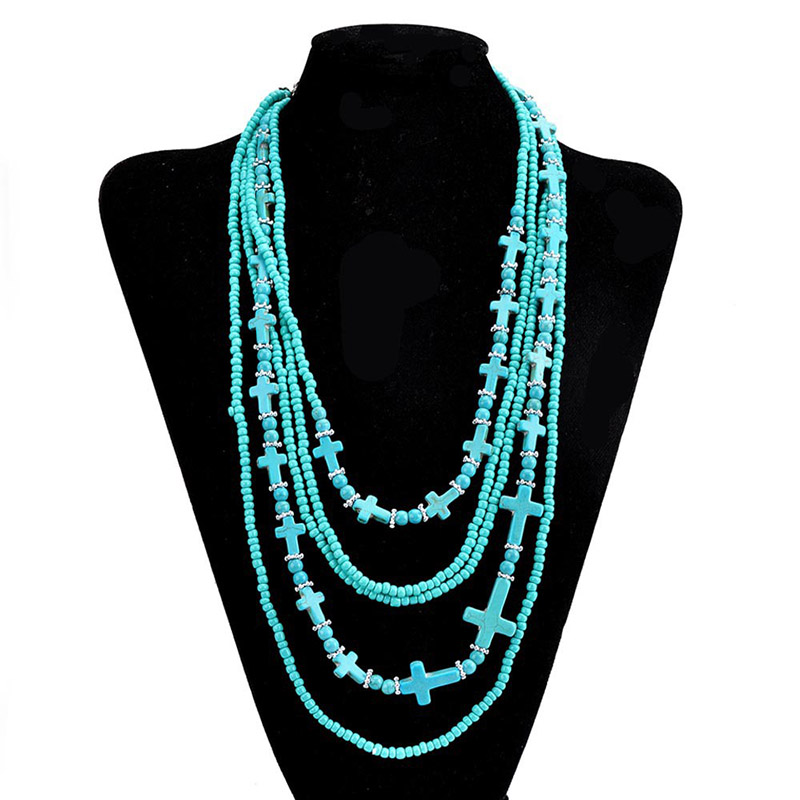 Vintage Turquoise Rice Beaded Multi-layer Cross Necklace