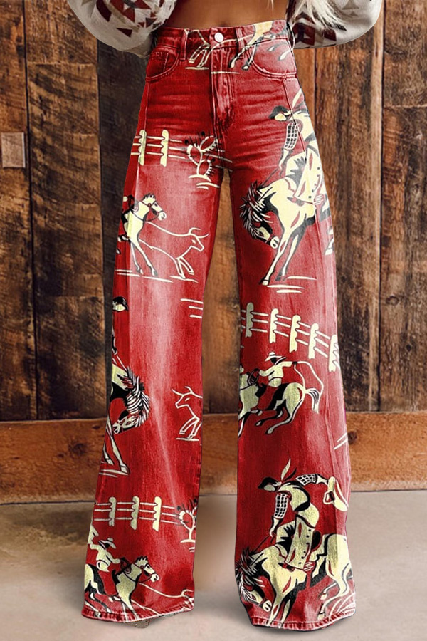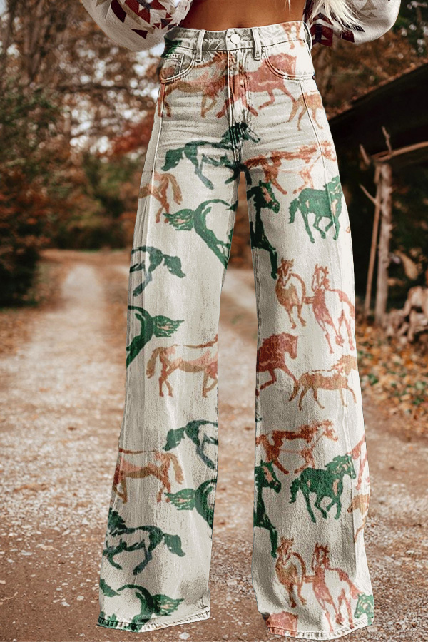 Western Boots Horseshoe Cactus Horse Print Wide Leg Pants