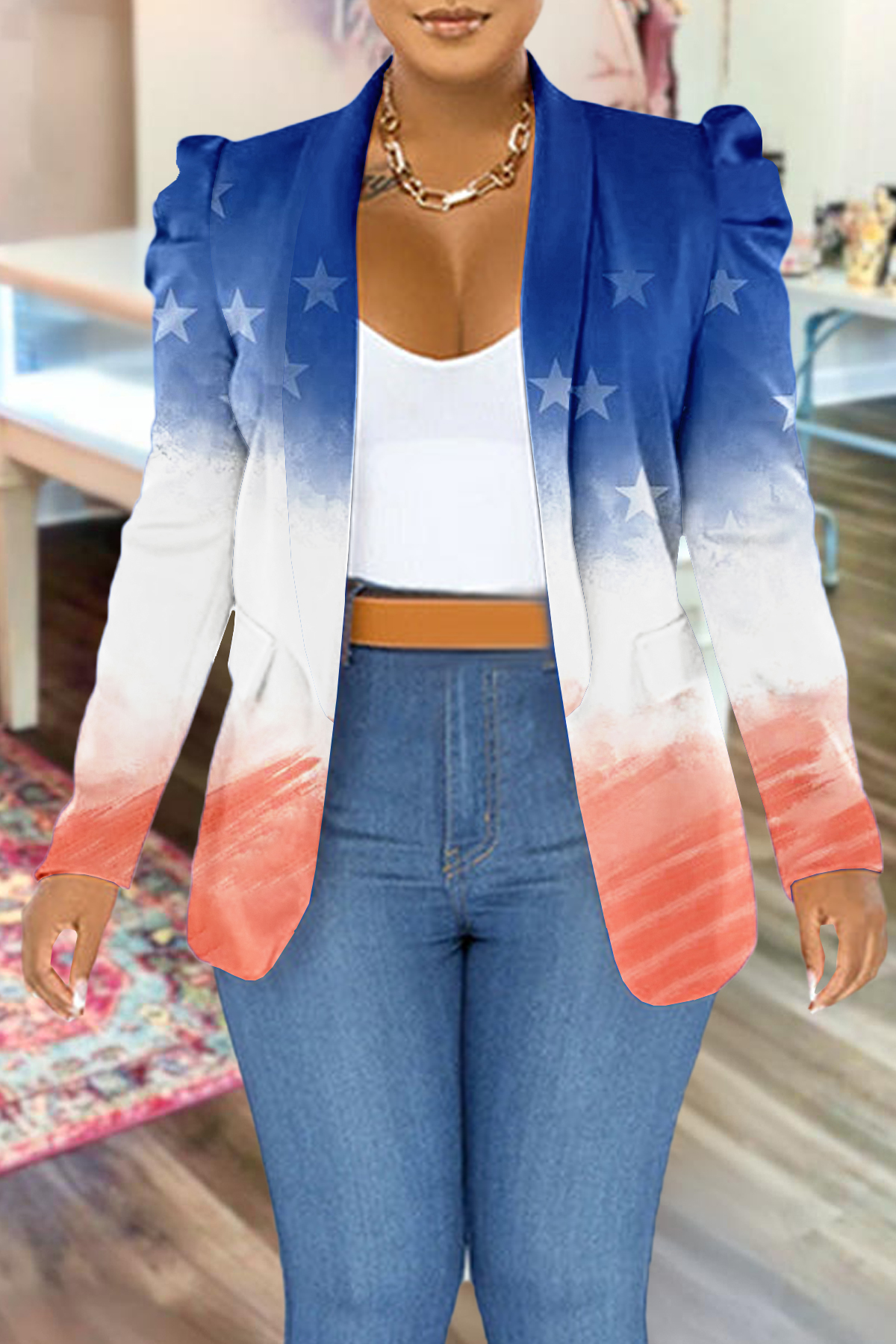 Classic Independence Day Star Print Puff Sleeve Blazer