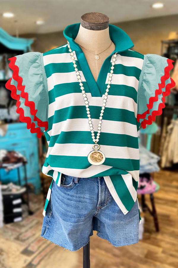 Western-Style Colorful Hat Striped Ruffle Sleeve Tee