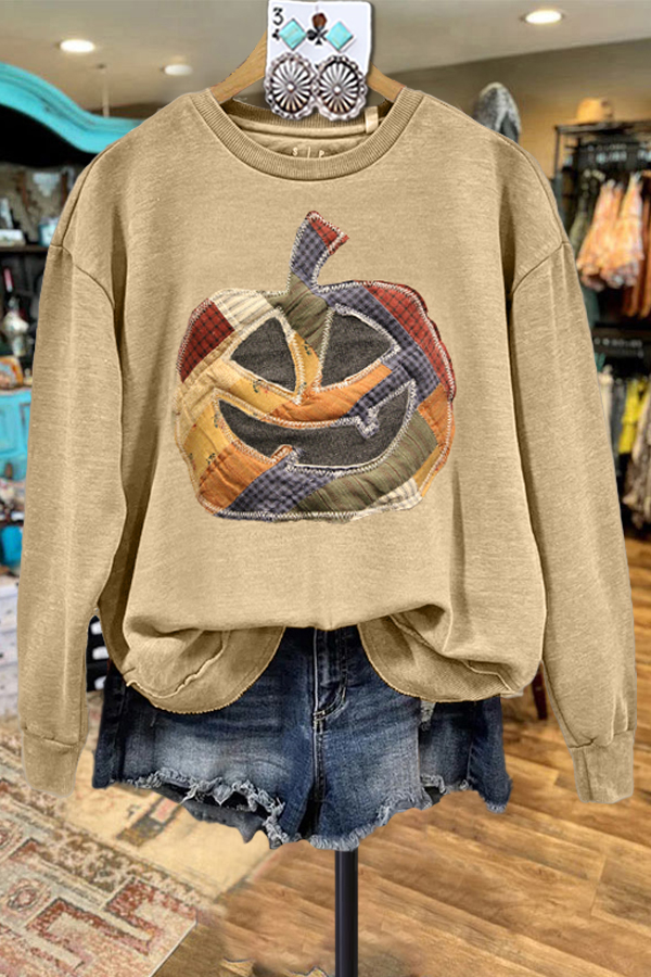 Casual Pumpkin Print Paneled Leopard Sweatshirt