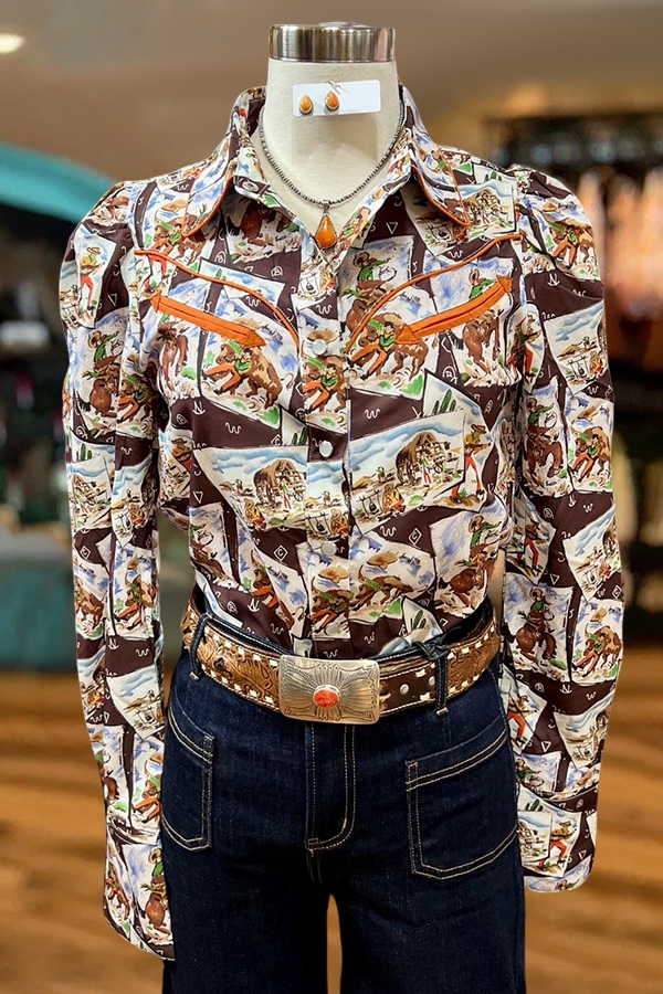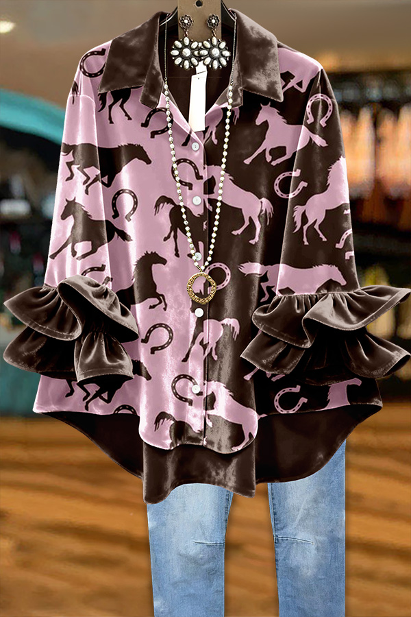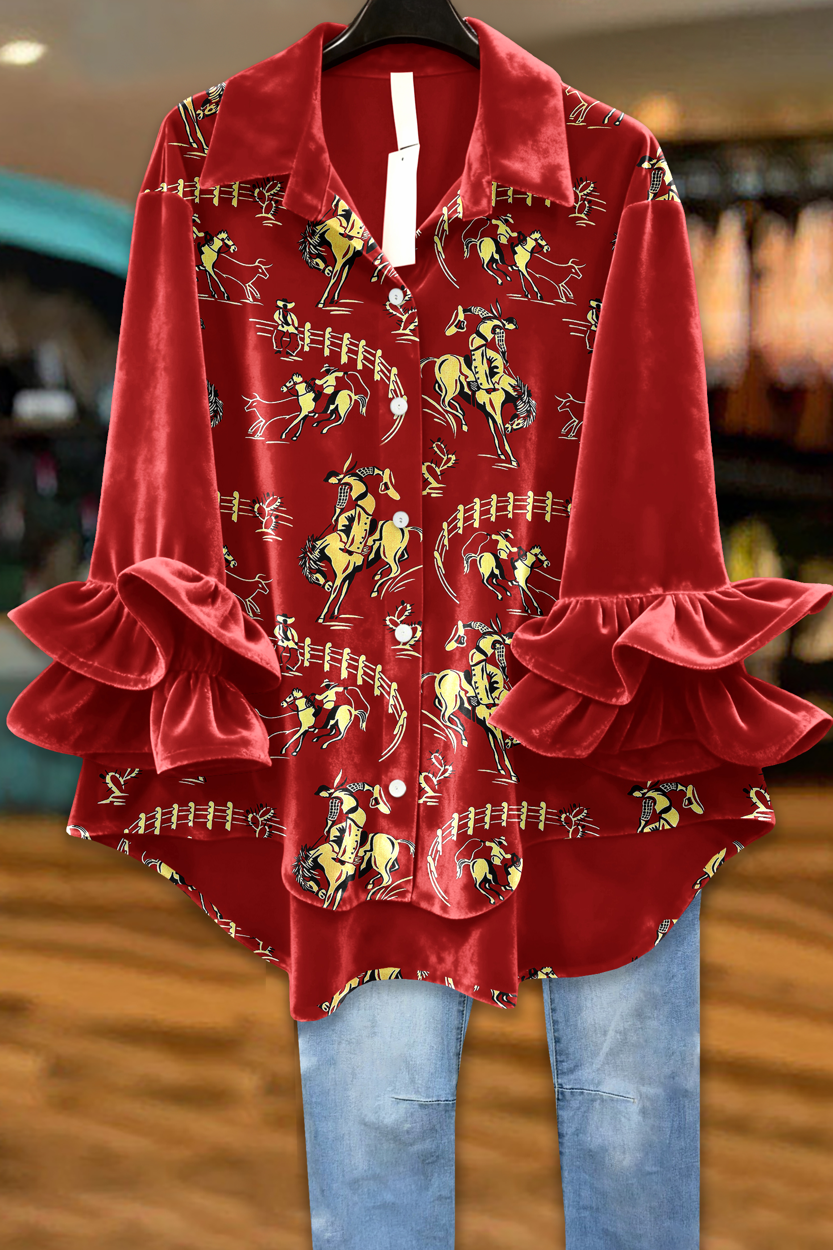 Western Boot Stitch Aztec Ruffled Velvet Blouse