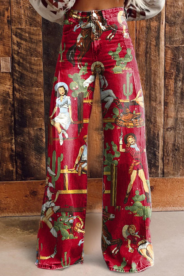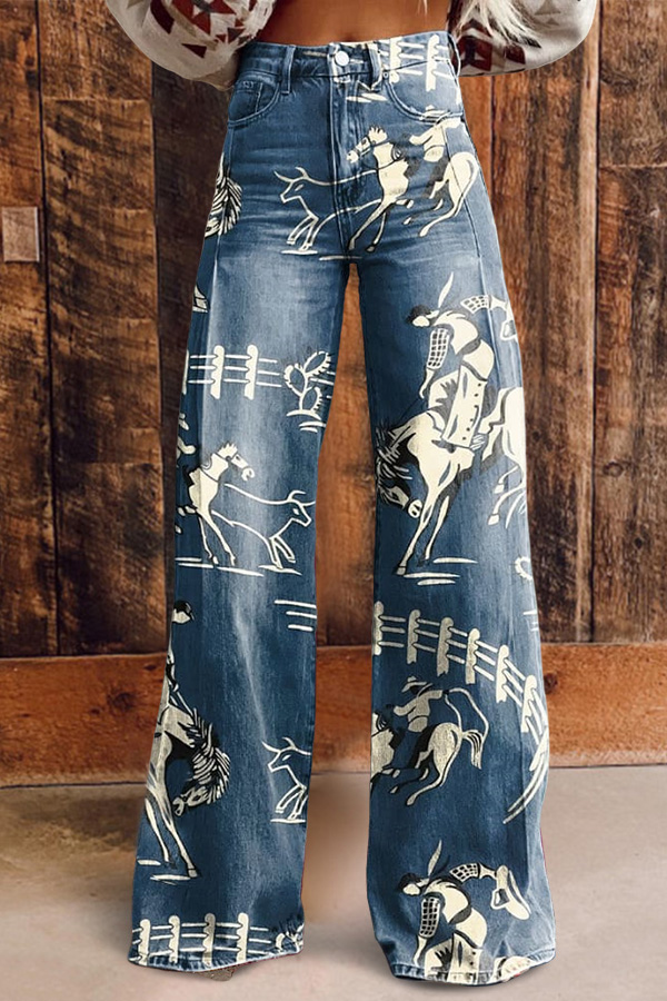 Vintage Cowboy Print Casual Wide Leg Pants