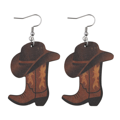 Western Cool Cowboy Hat Boots Wooden Earrings