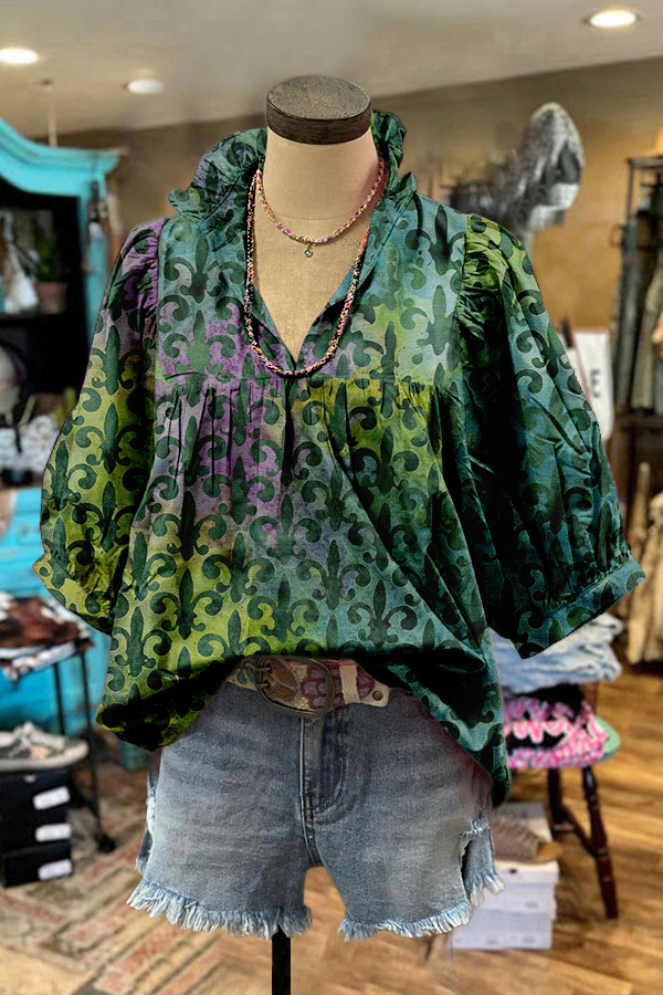 Stay on trend this season in our new chic, v neck top. We especially love the graphic print fabric and think this piece will be a new favorite in your closet!