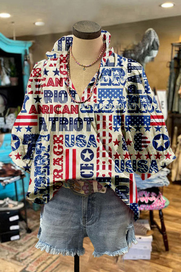 Chic Patriotic Day Print Puff Sleeve Blouse