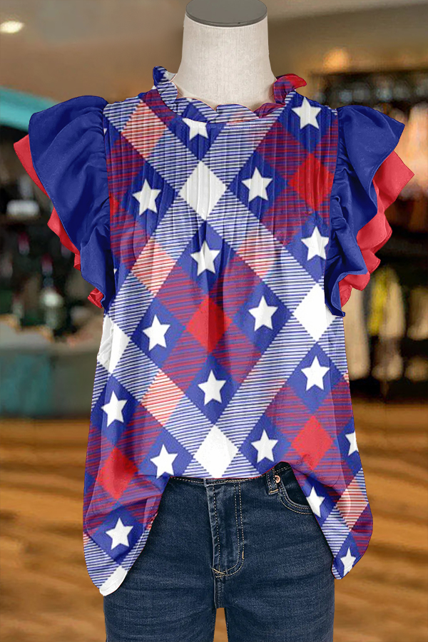 Classic Patriotic Day Print Ruffled Sleeve Paneled Pleated Blouse