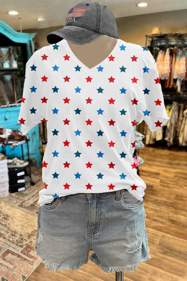 Stay on trend this season in our new classic, v neck t-shirt. We especially love the star fabric and think this piece will be a new favorite in your closet!