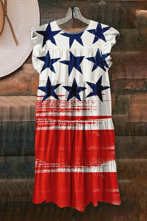Cute Stars Patriotic Day Print Ruffled Pleated Dress