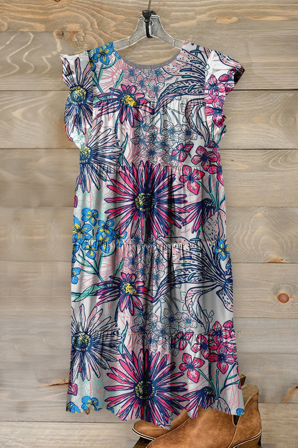 Sweet Floral Print Ruffled Pleated Dress