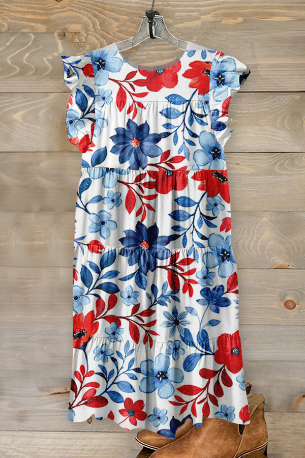 Sweet Floral Patriotic Day Print Ruffled Pleated Dress