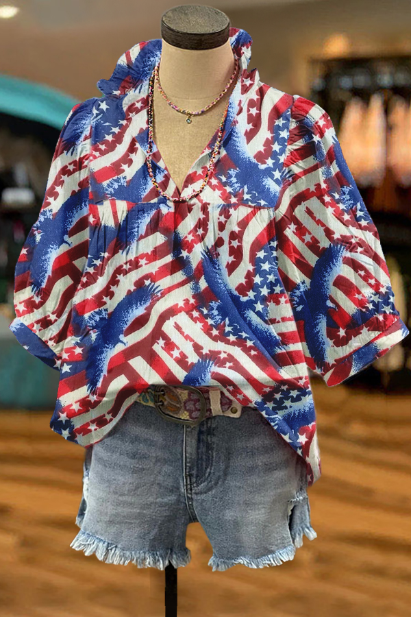 Classic Independence Day Eagle Print Puff Sleeve Blouse