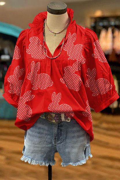 Classic Easter Bunny Polka Dot Print Puff Sleeve Blouse
