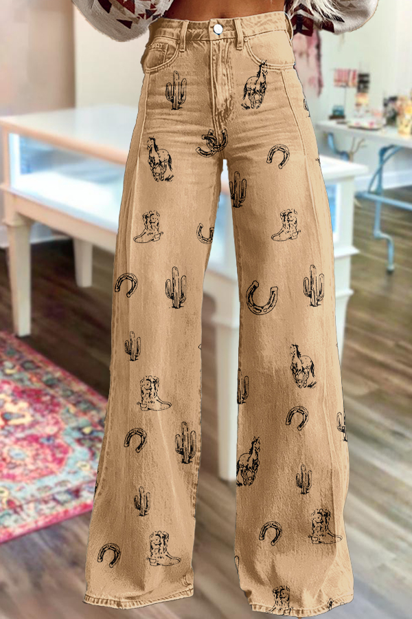 Western Boots Horseshoe Cactus Horse Print Wide Leg Pants