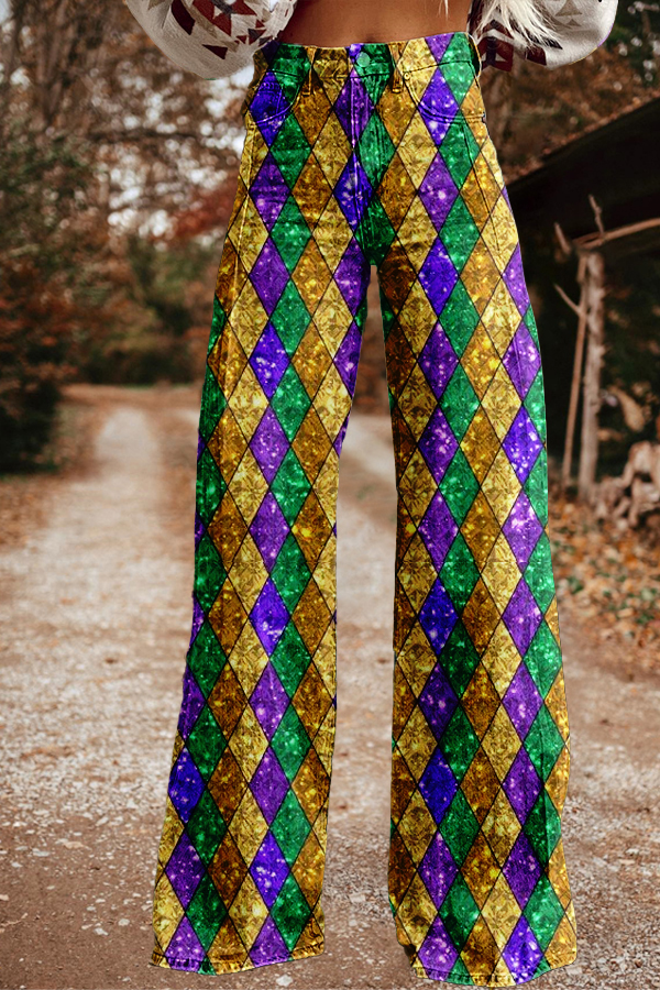 Vintage Mardi Gras Print Wide Leg Trousers