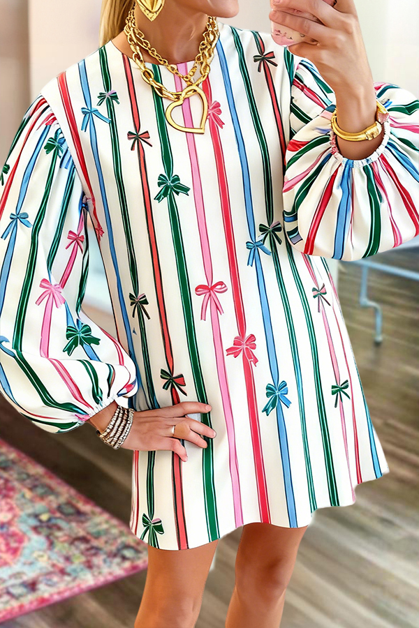 Colorful Striped Bow Puff Sleeve Mini Dress