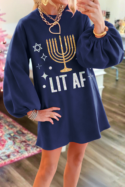 Hanukkah Lit Af Puff Sleeve Sweatshirt Dress