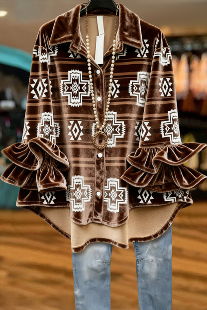 Velvet Western Aztec Printed Ruffle Top