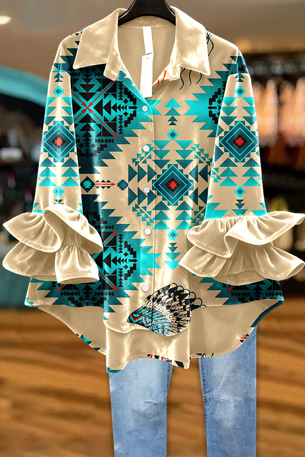 Western Turquoise Aztec Velvet Ruffle Top