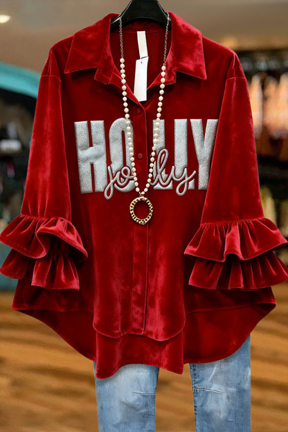 Stay on trend this season in our new casual, shirt collar top. We especially love the holiday fabric and think this piece will be a new favorite in your closet!