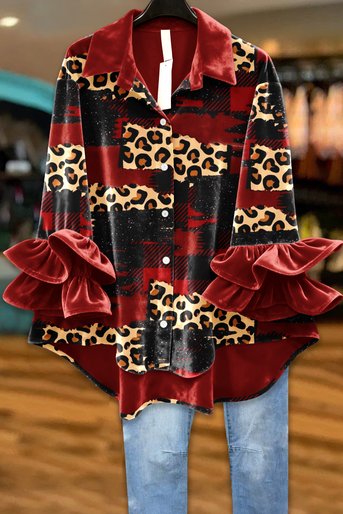 Classic Leopard Print Patchwork Ruffle Velvet Blouse