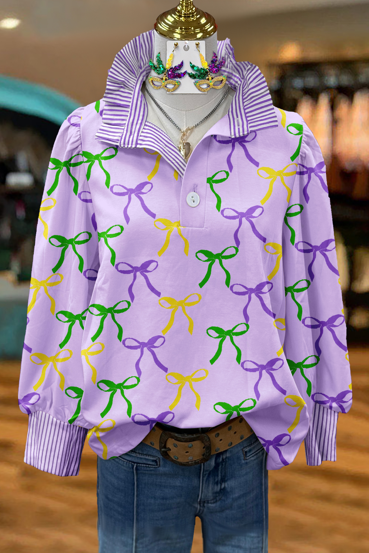 Stay on trend this season in our new classic, shirt collar top. We especially love the stripe fabric and think this piece will be a new favorite in your closet!