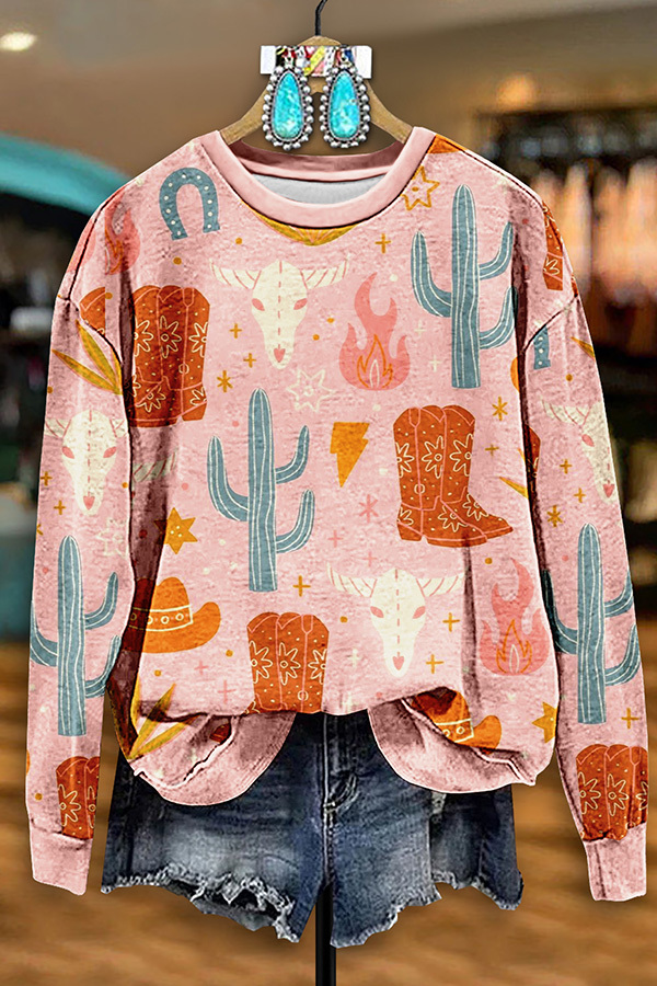 Vintage Western Boots Cactus Print Sweatshirt
