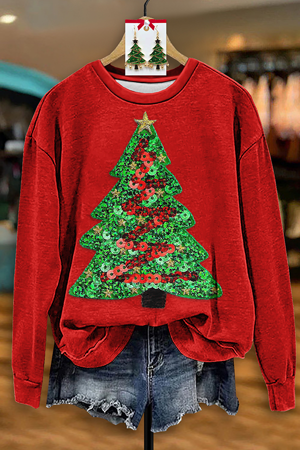 Pretty Sequined Christmas Tree Print Sweatshirt
