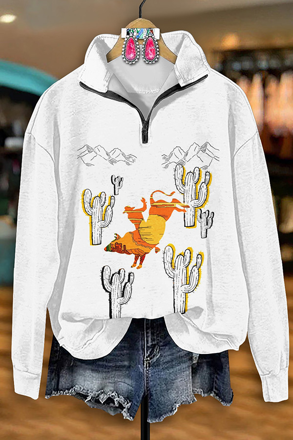 Vintage Western Cactus Print Zip-Up Sweatshirt
