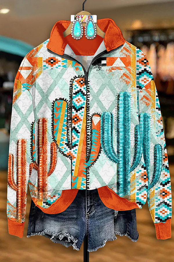 Retro Western Aztec Cactus Print Zip-Up Sweatshirt