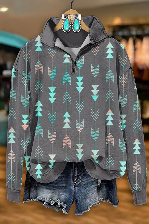 Retro Western Aztec Arrow Print Zip-Up Sweatshirt