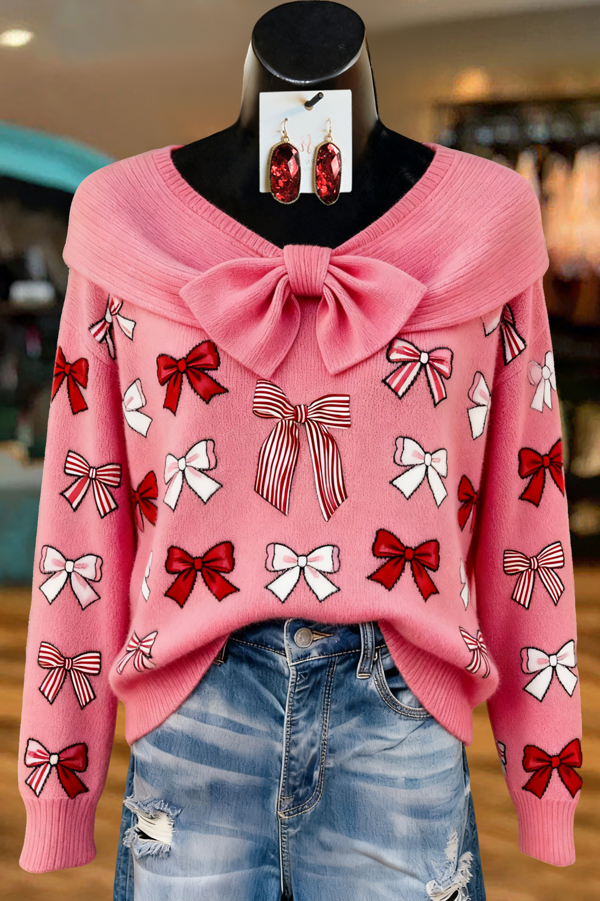 Stay on trend this season in our new sweet, pussy bow sweater. We especially love the graphic print fabric and think this piece will be a new favorite in your closet!