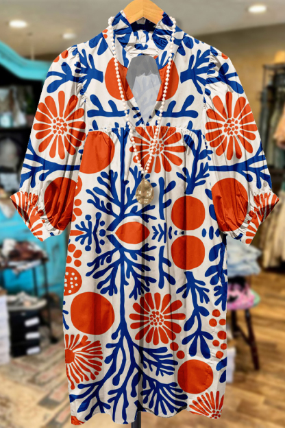 Stay on trend this season in our new elegant, v neck dress. We especially love the graphic print fabric and think this piece will be a new favorite in your closet!