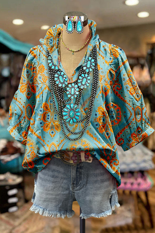 Stay on trend this season in our new elegant, v neck top. We especially love the graphic print fabric and think this piece will be a new favorite in your closet!