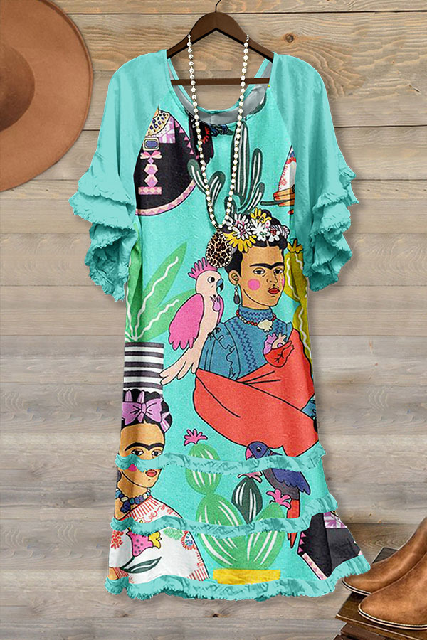 Frida Cactus Ruffle Raglan Midi Dress