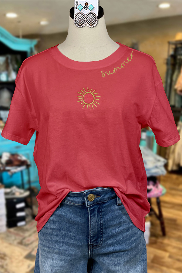 Stay on trend this season in our new casual, round neck top. We especially love the abstract embroidery fabric and think this piece will be a new favorite in your closet!