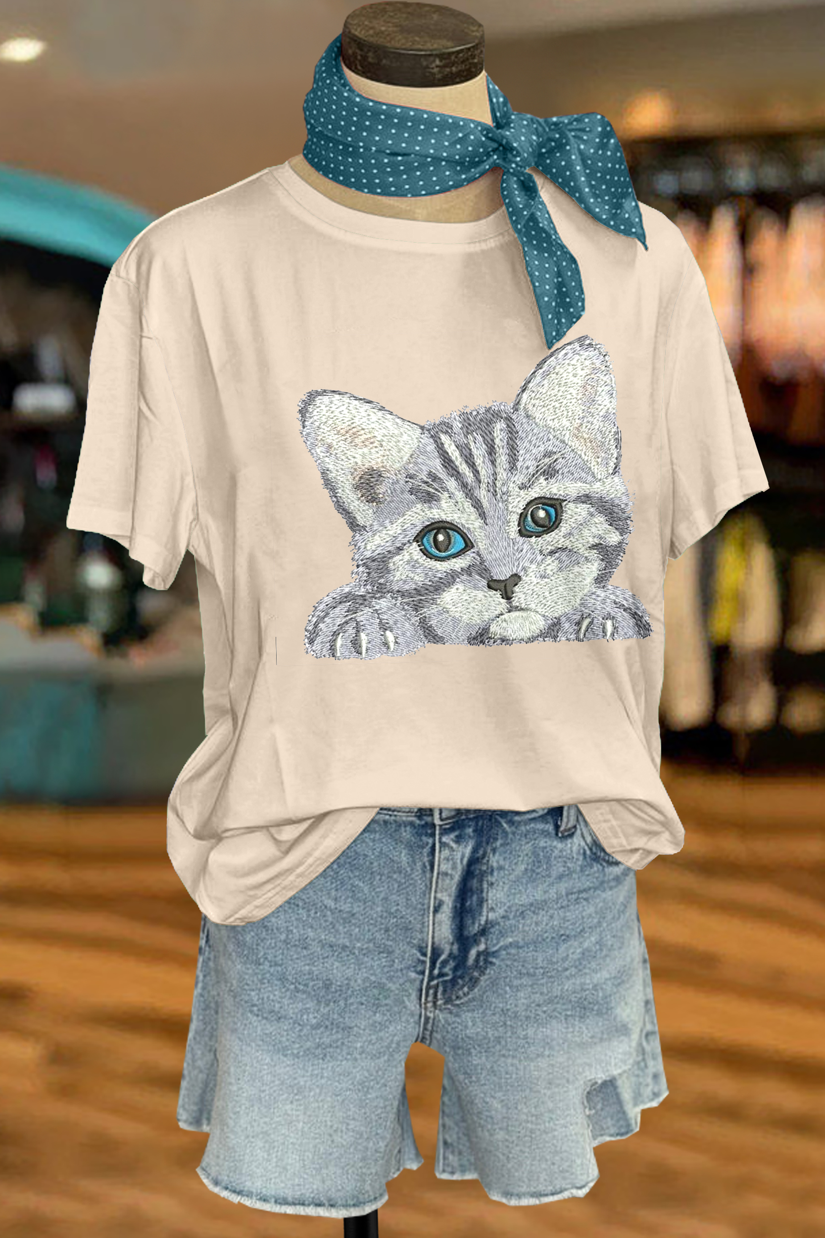 Cute Cat Embroidered T-Shirt