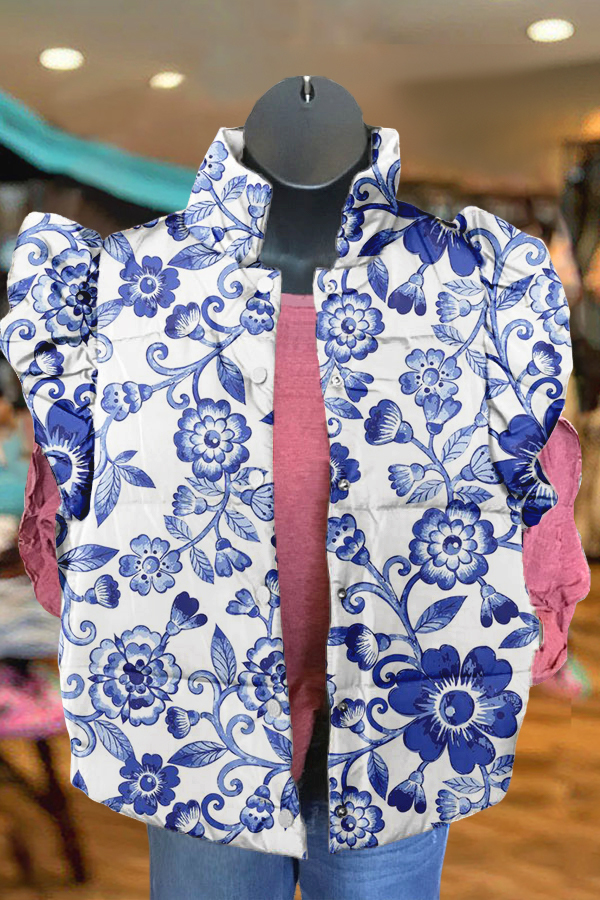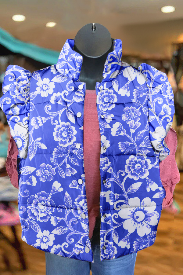 Elegant Blue Floral Print Ruffle Vest